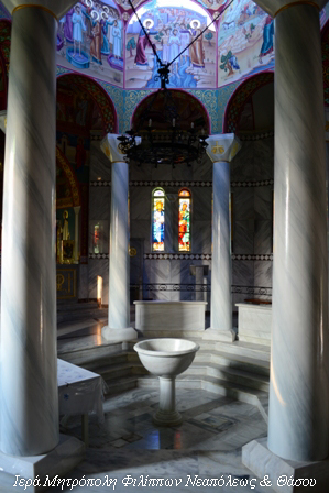6. Μοναδικές για τις συνθέσεις τους οι αγιογραφίες στη βάση του Οκταγώνου του τρούλου. Ιστορούν τα οκτώ (8) βαπτίσματα από τις πράξεις των Αποστόλων και μεταξύ αυτών και το βάπτισμα του Απόστολου Παύλου από τον Απόστολο Ανανία στη Δαμασκό. Επίσης, μέρος των Αγιογραφιών της οροφής, που πρόσφατα τοποθετήθηκαν και οι οποίες εξιστορούν τα γεγονότα που έλαβαν χώρα εις τους Φιλίππους μετά το όραμα και την άφιξη του Παύλου όπως: το κήρυγμα στο Ζυγάκτη ποταμό στις συνελθούσες γυναίκες, η βάπτιση της Λυδίας η φυλάκιση των Αποστόλων, ο σεισμός κ.λ.π. Οι αγιογραφίες της οροφής συνεχίζονται εντατικά καθώς επίσης και αυτές του Νάρθηκα του Ιερού Βαπτιστηρίου στου οποίου το δάπεδο είναι φιλοτεχνημένο μοναδικό ψηφιδωτό με την περιοδεία του Παύλου στους Φιλίππους, Βέροια, Αθήνα και Κόρινθο.